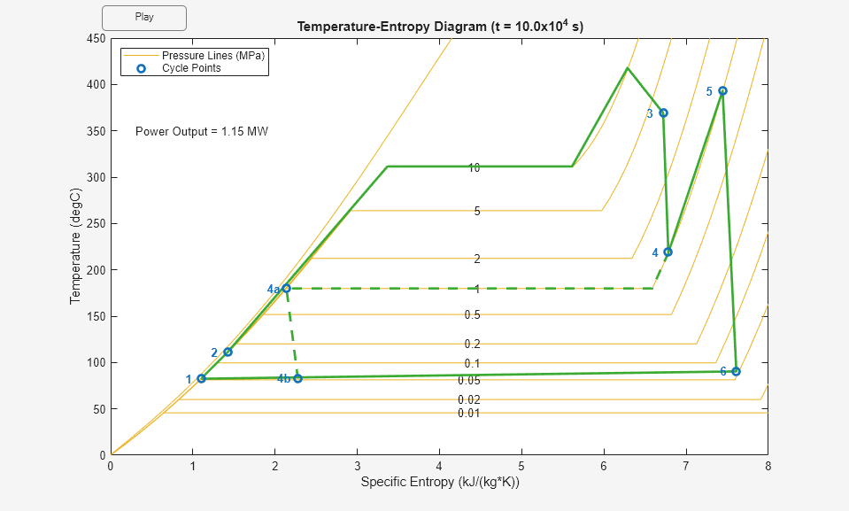 This figure shows an animation of the Rankine Cycle on a temperature-entropy diagram over time. The main steam flow corresponds to the loop from Cycle Points 1 to 6. The extracted steam flow corresponds to the dashed line from Cycle points 4 to 4b. In this model, the throttle valve before Cycle Point 3 provides a small amount of control over the power output.