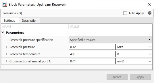 Change the Upstream Reservoir block to have a specified pressure of 0.12 MPa and temperature of 400 K.
