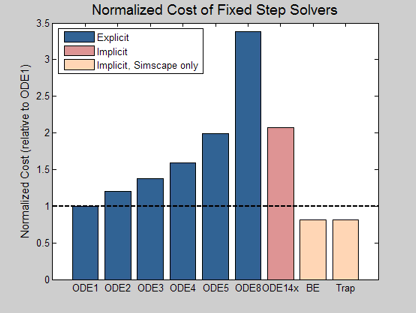 For a given accuracy, explicit global solvers generally have a lower computational cost than implicit global solvers. Local (Simscape only) solvers are less costly than global solvers.