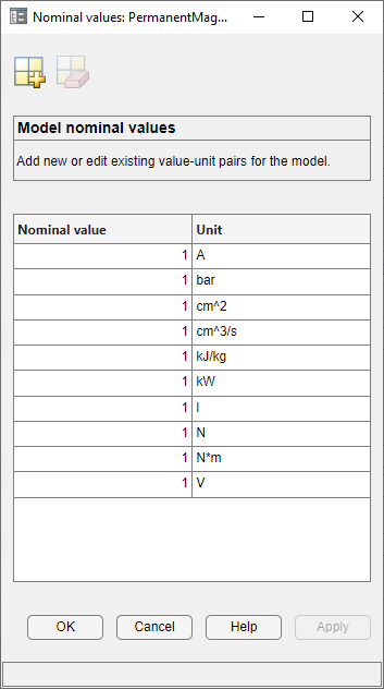The model table of nominal values opens in a new window. It contains all the value-unit pairs currently defined for the model.