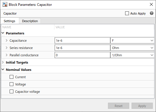 Block — You can specify nominal value and unit as variable declaration attributes in a Simscape component file underlying the block. These attributes translate into block parameters