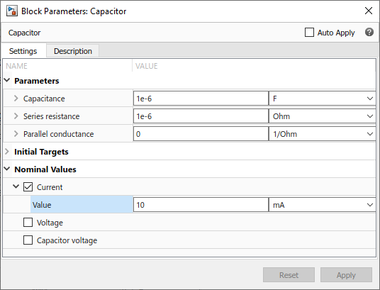 If the check box is selected, the model provides the scaling information to the solver based on the specified nominal values. To view, add, and edit the value-unit pairs for the model, click the Specify nominal values button next to the Normalize using nominal values check box.