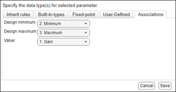 4. Click Associations to associate a data type parameter with an Edit parameter. Select the a min parameter Minimum, a max parameter Maximum in Design minimum and Design maximum to associate the minimum and maximum parameter to the edit parameter Gain parameter.