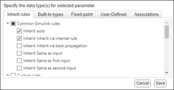 Inherit rules — Specify inheritance rules for determining the data types. The inheritance rules are grouped under three categories: Common Simulink rules, Custom rules, and Advanced Simulink rules. The Advanced rules section allows you to inherit rules from the blocks such as Lookup table, Constant, and Gain. For example, breakpoint data, constant value, gain, table data, logic data, accumulator, product output, and Simulink. It also allows you to have same word length as input and have same data types for all ports. The Custom rules section lists any custom inheritance rules registered on the MATLAB® search path. For definitions of some Inheritance rules, see Data Type Inheritance Rules.