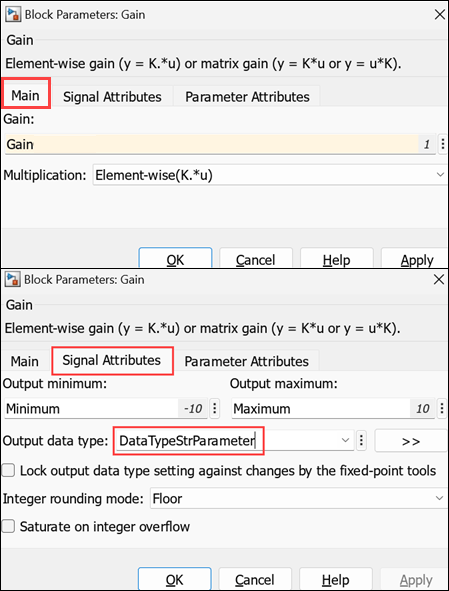Note: The difference between Data Type parameter and Parameter constraints is that data type parameter converts the input signal to the data type selected in the mask dialog and parameter constraint validates the signal against a condition.