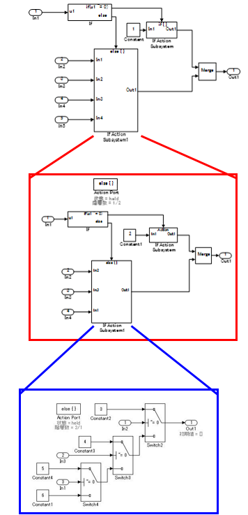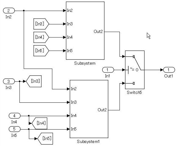 For bifurcation of systems where the bifurcation condition nest has a deep structure, split by using function conversions to decrease the code bifurcation nesting. Functions before and after the Switch block are divided into respective subsystems, and function settings are applied to the atomic subsystem+function. Be aware, it is possible that this may result in unintentional implementation and unnecessary RAM requirements.