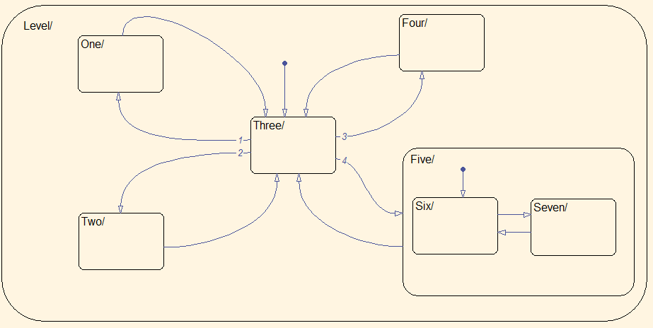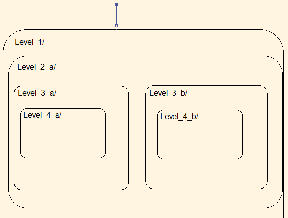 Example of a model using five levels of nesting. Layering by using a subsystem does not occur because there is no internal state.