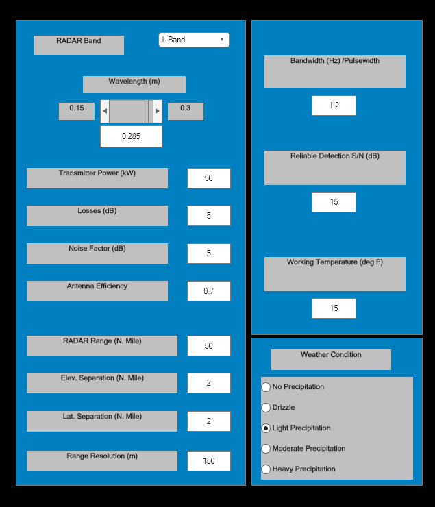You can run the simulation to determine if the radar can pick up the aircraft by the output on the scope. Using the GUI, the radar and the weather parameters can be altered and will change the range where the aircraft can be "seen".