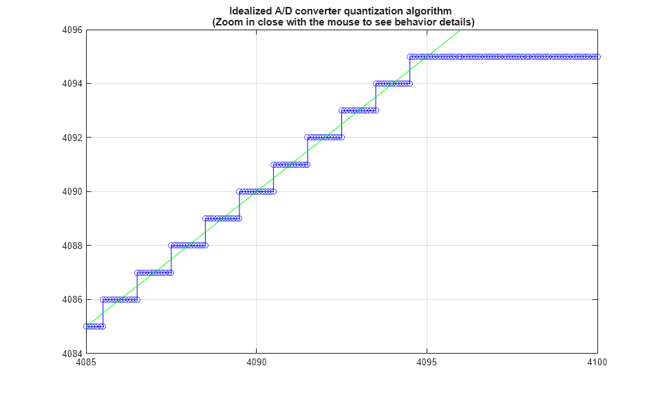 The quantization algorithm in the model takes in a 0 to 5 volt signal and outputs a 12-bit digital word in a 16-bit signed integer. A value of 0 corresponds to 0 Volts and a value of 4096 would correspond to 5 Volts. A change in the least significant bit (LSB) is about 1.2 mV. As 12 bits can only reach the value of 4095, the highest voltage that can be read by this device is approximately 4.9988 Volts. In order to have no more than 1/2 LSB error within the operating range, the quantizer changes values midway between each voltage point, resulting in a 1/2-width interval at 0 Volts and a 3/2-width interval just below 5 Volts. The last interval has 1 full LSB due to its 3/2-width size.