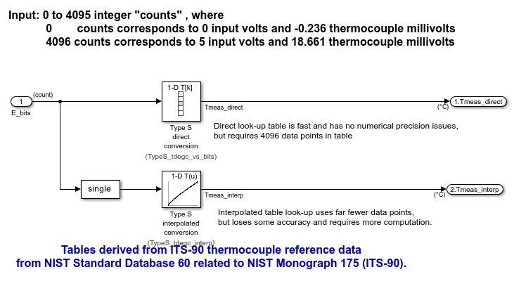 An alternative implementation to using the polynomial is an interpolated look-up table. Table data could be used in a look-up table block in place of the polynomial block. Sample data was constructed from NIST Standard Database 60 for a Type S thermocouple in file sldemo_create_tc_tabledata.m. Access to this database is described below in the section titled "Thermocouple Reference Data Download and Import Procedure".