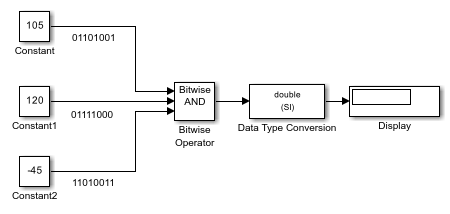 Each Constant block outputs an 8-bit unsigned integer (uint8). To determine the binary value of each Constant block output, use the dec2bin function. The results for all logic operations appear in the next table.