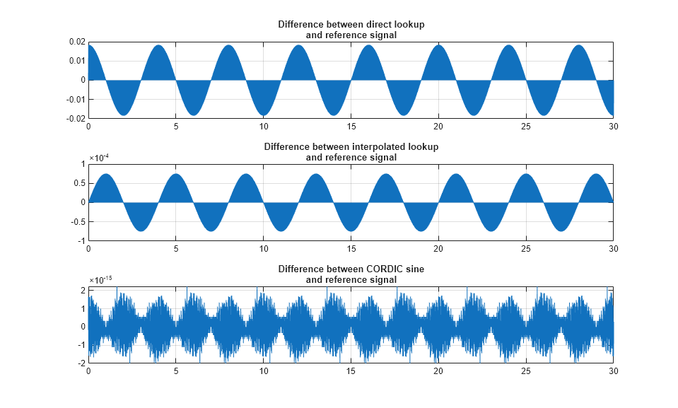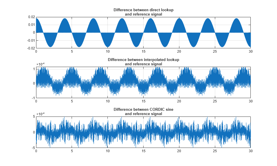 currentFig = figure('Color',[1,1,1]); subplot(3,1,1), plot(out.tonegenOut.time, out.tonegenOut.signals(1).values); grid title({'Difference between direct lookup', 'and reference signal'}); subplot(3,1,2), plot(out.tonegenOut.time, out.tonegenOut.signals(2).values); grid title({'Difference between interpolated lookup', 'and reference signal'}); subplot(3,1,3), plot(out.tonegenOut.time, out.tonegenOut.signals(3).values); grid title({'Difference between CORDIC sine', 'and reference signal'});