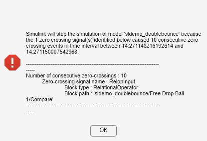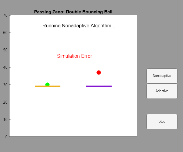 If the Non-adaptive zero-crossing location algorithm is used, the consecutive zero-crossing error causes the simulation to stop. This system is actually a 'Zeno dynamic system'. When either ball is very close to the ground, Simulink will stop responding because too many zero crossings are detected in a very short period.