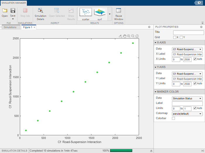 To add another figure to the Simulation Manager, click surf or scatter plot and add plots as desired. In this example, click surf plot, located in the Results section of the toolstrip. Drag the Figure 2 tab to view the two plots together.