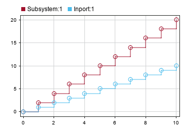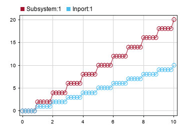 Simulate the model again. Because input port data drives the partition execution, the simulation takes a step only when the input value updates.