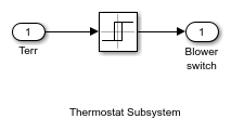The Thermostat subsystem contains a Relay block. The thermostat allows fluctuations of 5 ºF above or below the desired room temperature. If air temperature drops below 65 ºF, the thermostat turns on the heater.