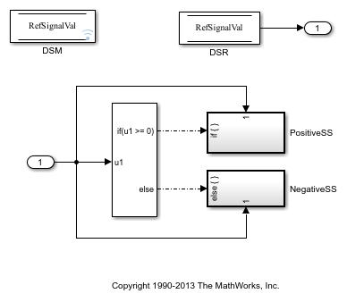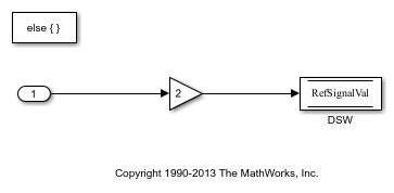 The NegativeSS subsystem contains the blocks that amplify the incoming signal by 2 if the signal is negative and write the value of this signal to local data store RefSignalVal.
