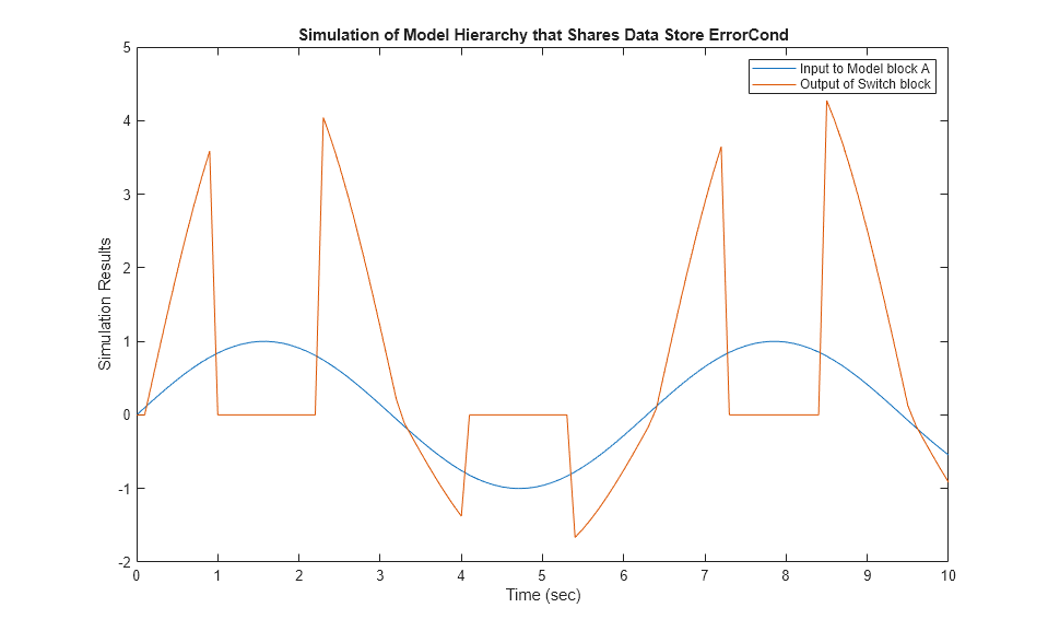 Simulate sldemo_mdlref_dsm to see the output. The referenced model sldemo_mdlref_dsm_bot writes to the data store ErrorCond while the top model sldemo_mdlref_dsm reads from the data store. The blue line represents the input to Model block A, which references the model sldemo_mdlref_dsm_bot. The orange line represents the output of the Switch block. The output switches when the magnitude of the input signal falls outside of the range.