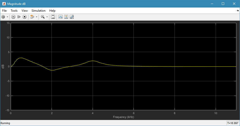 Connect headphones or speakers to your development computer if it does not have any. In the model, click the Run button on the toolbar to start simulation. When the model is simulating, the ArrayPlot shows the equalizer's response in terms of band gains over frequencies. The response is computed using a Discrete Transfer Function Estimator block. This block estimates the frequency-response of equalizer using the Welch's method. The response will change as you tune the equalizer specifications. You can also listen to either the original or equalized audio by toggling the switch inside bypass controller subsystem.