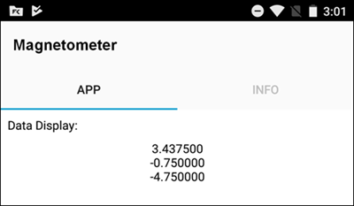 The Magnetometer block reads the strength of the magnetic field around an Android™ device. The built-in magnetometer sensor on the Android device measures the magnetic field along the X, Y, and Z axes. The block outputs the magnetic field as a 1-by-3 vector in microtesla (μT).