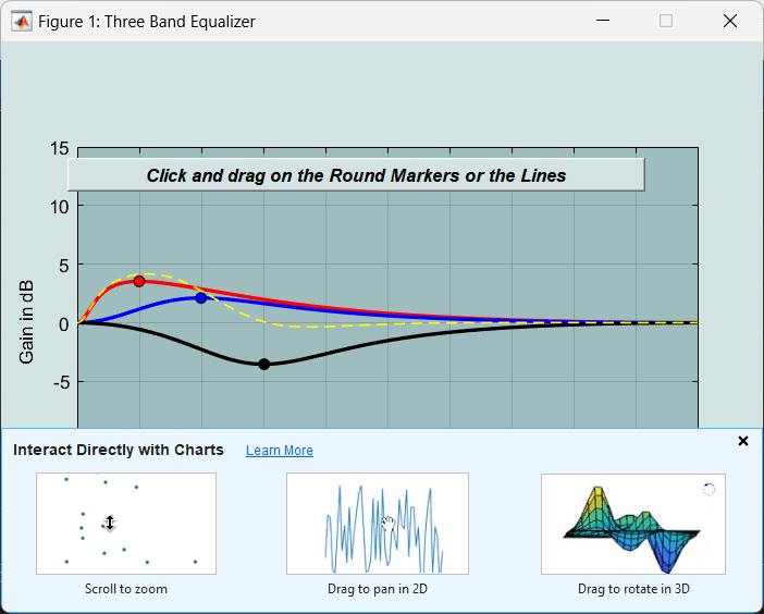 3. Click and drag the markers or lines in the Three Band Equalizer GUI to specify the desired filter response characteristics. Note the change in audio output as the frequency response of the equalizer changes.