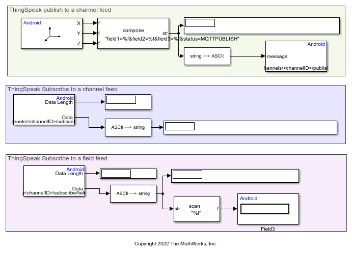 • androidMQTTThingSpeak1 — This Simulink model shows how to use ThingSpeak as an MQTT broker to publish and subscribe to a field of a channel. The accelerometer sensor data X-, Y-, and Z- axes values are published to three fields of a ThingSpeak channel and also subscribed to a ThingSpeak field.