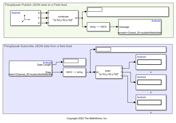 • androidMQTTThingSpeak2 — This Simulink model uses ThingSpeak as the broker to publish and subscribe accelerometer data in the JSON format from the channel field.