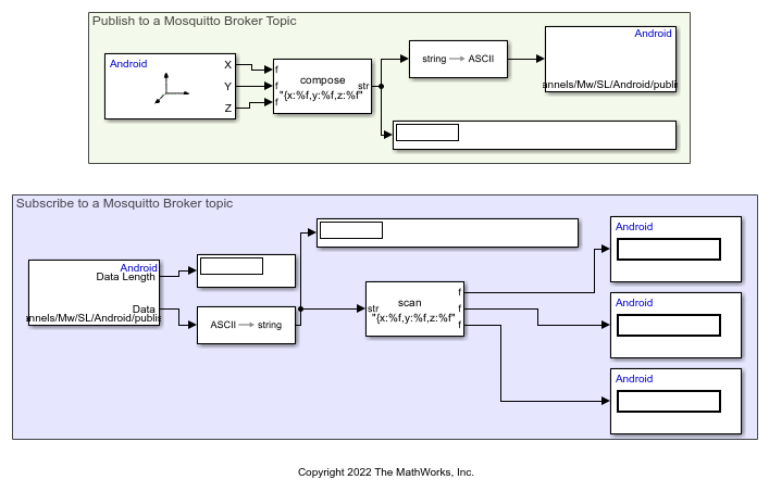 This example shows how to use the Simulink® Support Package for Android® Devices to subscribe and publish data to topics of ThingSpeak™ and Mosquitto™ brokers via MQTT protocol.