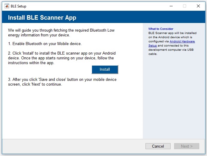 3. A wizard will open on your development computer providing instructions to install BLE Scanner app as shown in the screenshot below.