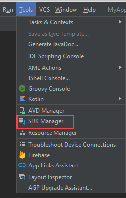 • From your Android Studio application toolbar, select Tools > SDK Manager.