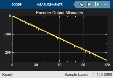 4. On the Simulation tab of the Simulink model, click Run. Click the Scope block and observe that the Encoder Output Mismatch increases over time. This indicates that the vehicle will not move straight.