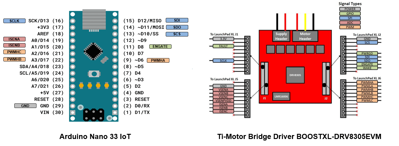 Connect the DRV8305EVM driver and the Arduino Nano 33 IoT board as shown in the following image.