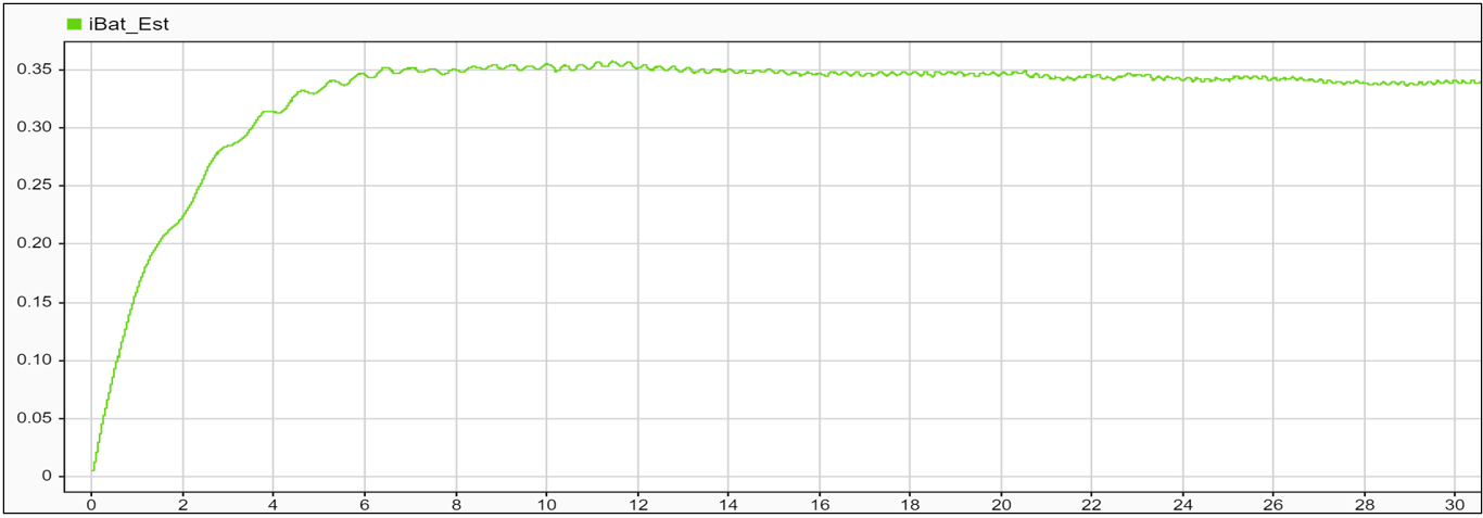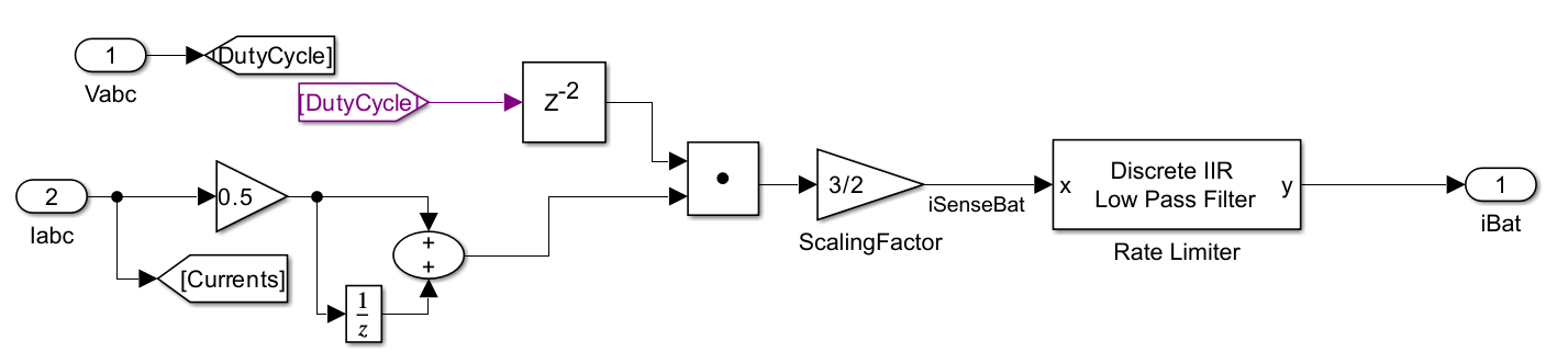 The inputs to this subsystem are the three phase currents Iabc and voltages Vabc. To make the Vabc and Iabc synchronous in time, a delay (z^-2) is added to the Vabc signal. The dot product of the Vabc and the averaged Iabc signals gives the estimated battery current. This signal is passed through a lowpass filter to eliminate the high frequency oscillations in the signal.