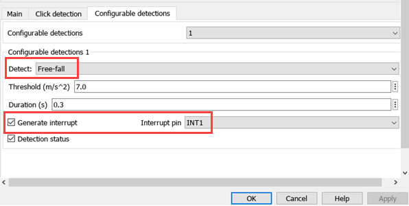 4. Ensure that the Free-fall is selected for Detect parameter and also ensure that Generate Interrupt parameter is selected and INT1 is selected for Interrupt pin