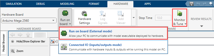 1. On the Hardware tab, in the Mode section, select Run on board (External Mode) and then click Monitor & Tune.
