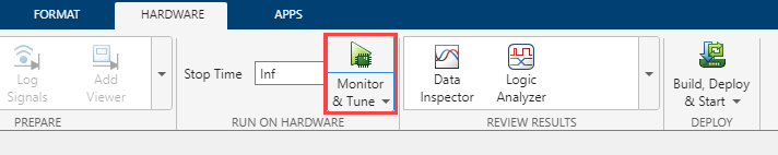 On the Hardware tab of the Simulink toolstrip, click Monitor & Tune to monitor signals and tune parameters.