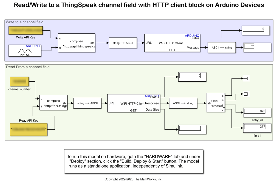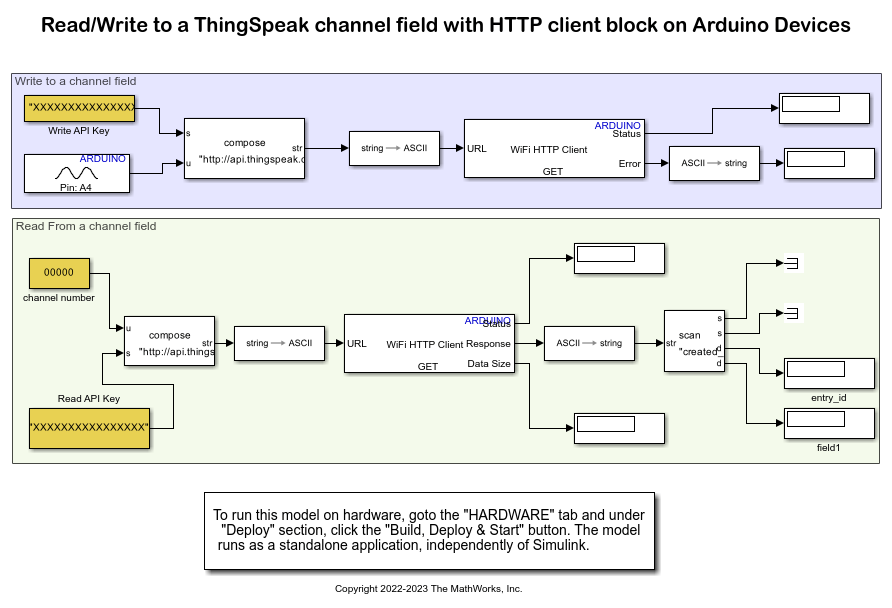 This example uses a preconfigured Simulink model that uses two WiFi HTTP Client blocks, one to write the ADC data to the ThingSpeak channel while, the other to read the ADC data from the ThingSpeak channel and display it on your Arduino hardware.