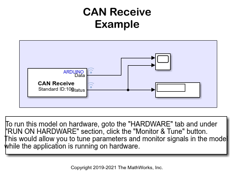 This example uses the Arduino CAN Receive model, with a CAN Receive block, to receive 1 byte of data by the Arduino hardware.