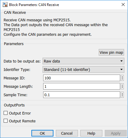 In this example, the Arduino CAN Transmit model with a CAN Transmit block is used to transmit data. The Arduino CAN Receive model with a CAN Receive block is used to receive data.