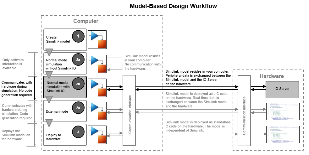 Simulation with Connected IO: The model communicates with the hardware. There is no code generation.