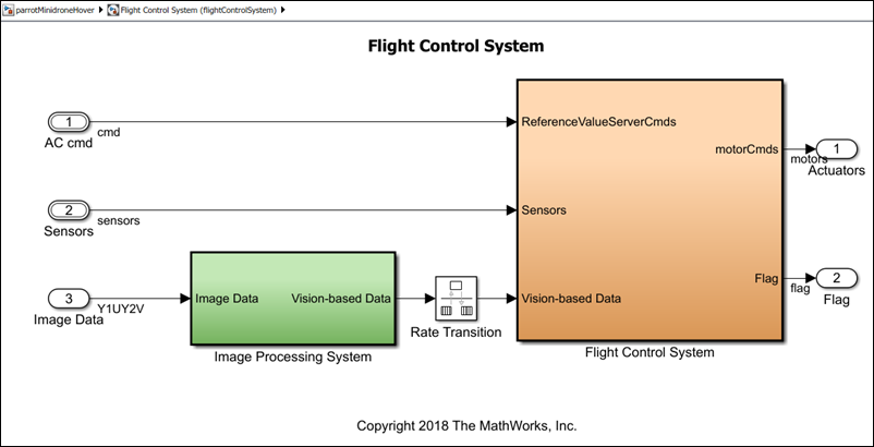 parrotMinidroneHovermodel, right-click the Flight Control System reference model, and select Open As Top Model. TheflightControlSystemmodel opens in a separate window.