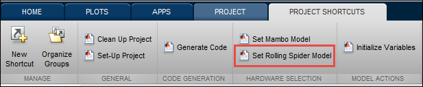 parrotMinidroneHovermodel in normal simulation mode. Navigate through the different subsystems to learn about the modeling hierarchy and quadcopter dynamics. You can also view the Simulink 3-D animation of the model. For more information, see Quadcopter Dynamics.Once the Simulink project is open, click the Project Shortcuts tab and perform one of the following tasks based on the type of Parrot minidrone connected: