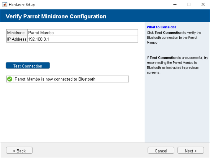 Before you begin, complete the instructions (Step 1 to Step 3) listed in the Connect a Parrot Mambo Minidrone to a Windows System Using Built-in Bluetooth Module or Generic Bluetooth Dongle.