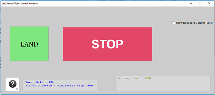 The Flight Control Interface opens automatically after the deployment of the model on Parrot minidrone is successful, if you had selected the option Launch Parrot Flight Control Interface automatically after build in the Configuration Parameters dialog box in Simulink. However, you can also open this interface by one of these options: