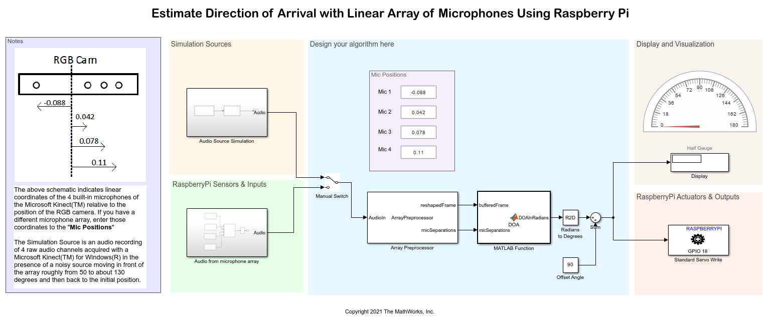 This example shows how to use the Simulink® Support Package for Raspberry Pi® Hardware to estimate the Direction of Arrival (DOA) of a sound source using multiple microphone pairs within a linear array using the Raspberry Pi hardware board. A servo motor is used to point towards the sound source based on the estimated DOA.