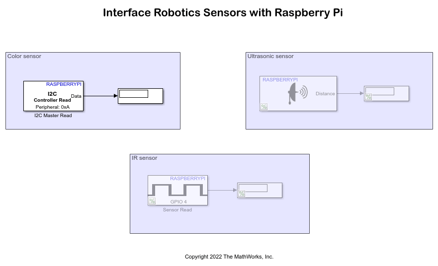 This example shows how to use Simulink® Support Package for Raspberry Pi® Hardware and a Raspberry Pi hardware board to get started with the driver blocks for commonly used robotics sensors.