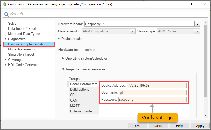 b. Go to Hardware Implementation > Hardware board and select Raspberry Pi.