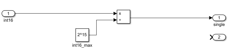 The int16 output from the Audio File Read block is converted to single datatype in the Normalized int16 to single subsystem. Double-click the Normalized int16 to single subsystem to open it.
