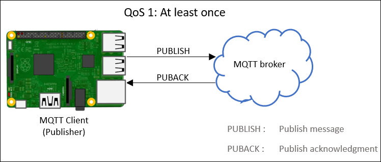 QoS 1: The publisher sends the message to the MQTT broker at least once. The publisher stores the message until it receives an acknowledgment from the broker. If no acknowledgment is received after 10 seconds, the publisher resends the message. In this level, the same message might be delivered to the broker more than once.