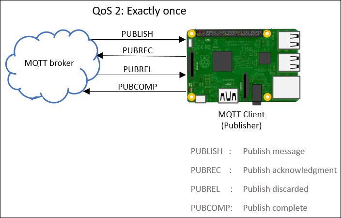 QoS 2: The publisher sends the message to the MQTT broker exactly once. The publisher stores the message until it gets an acknowledgment from the broker. Once the acknowledgment is received, the publisher and the broker discard the stored messages. QoS2 uses additional acknowledgments to ensure that no duplicate message is delivered to the broker.
